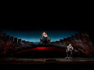 The Machine still looks dangerous to me though. It is a bit distracting as I worried about the safety of the singers often. It looks very slippery. One slat of The Machine was often out of line with the others, which diminished the overall effect at certain points. Regardless it is a cutting edge theatrical device. Eventually I imagine there will be fully fluid set machines able to take whatever form is needed onstage. I found myself thinking of something like a gigantic pin art device, morphing into different three dimensional landscapes and set pieces. Something like that is still a ways off but no doubt some variant is coming and on the drawing board somewhere.