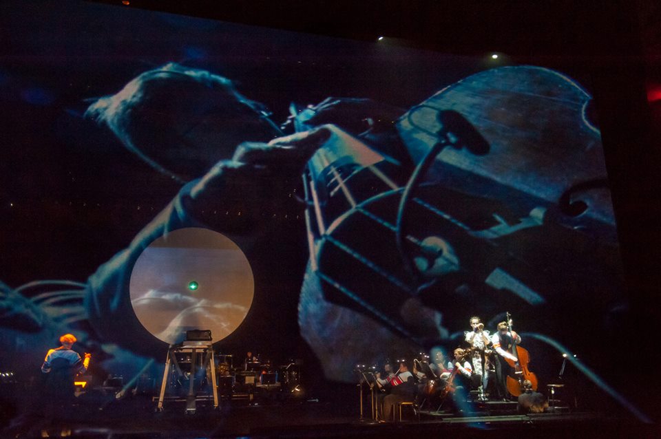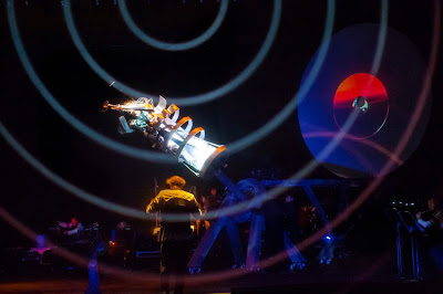 The music was modern and while there weren’t any vocals, except for a few German words called out, there was a clear conversation between Eve and Michael, Michael and the orchestra, and Michael telling his story to the audience. What Michael and Eve were talking about and what Michael was saying, I have no idea, but oddly it felt organic—a man in a trumpet “speaking” to the orchestra next to him onstage while a giant machine rotated and a wheel in the background sometimes acted as map and other times reflected a collection of skulls. As we traveled around the world (many of the “acts” were coming from specific locations on earth) and then left earth I found my mind wandering in a pleasant way, not out of boredom as I did during some operas last year. The music and the effects that Ensemble musikFabrik created were evocative and creative. I particularly loved the plumes of wavy lines projected onto the screen; sound waves emanating from Michael’s trumpet became visual waves once they hit the scrim.