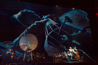 I have never attended an opera at Avery Fisher and knew this would be something different. Inside the hall, a scrim glowing cobalt blue stood between the audience and the on stage orchestra and some large machinery. At first I found the artificial distance created between orchestra and audience off putting, but the images later projected onto the scrim generated a diorama effect that was visually quite fun.
