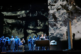 Musically the choral pieces were what worked best for me. Strikingly in fact. The “sound” of the internet chat room “innerverse” was rivetingly compelling. Muhly seemed to use more classic church like choral sounds for it as opposed to some sort of modern fusion industrial synthesized sound to depict the internet chatter. Effective as this world is the church for these kids. The chorus’ faces illuminated by their laptops and projections of snippets of chat room speak worked excellently in conjunction with their musical sequences. And right down the middle of the audial and visual chatter was the constant background drone of “Everybody Hates You. You Should Kill Yourself” which is later revealed as the key to Jake’s motivations.Structurally there were some problems with Two Boys as well. Why does the Detective sing about the “lost, rudderless” children of the chat rooms when she has only just learned of the chat room culture in the most topical way just a scene before? This could have come later. It felt forced and out of place where it was. Additionally, that Jake viewing Brian as his great and perfect true love was the impetus to his actions could have been better depicted for me. Instead, Alice Coote’s Detective Strawson simply sings a line twice that tells us that. Show don’t tell always works better.
