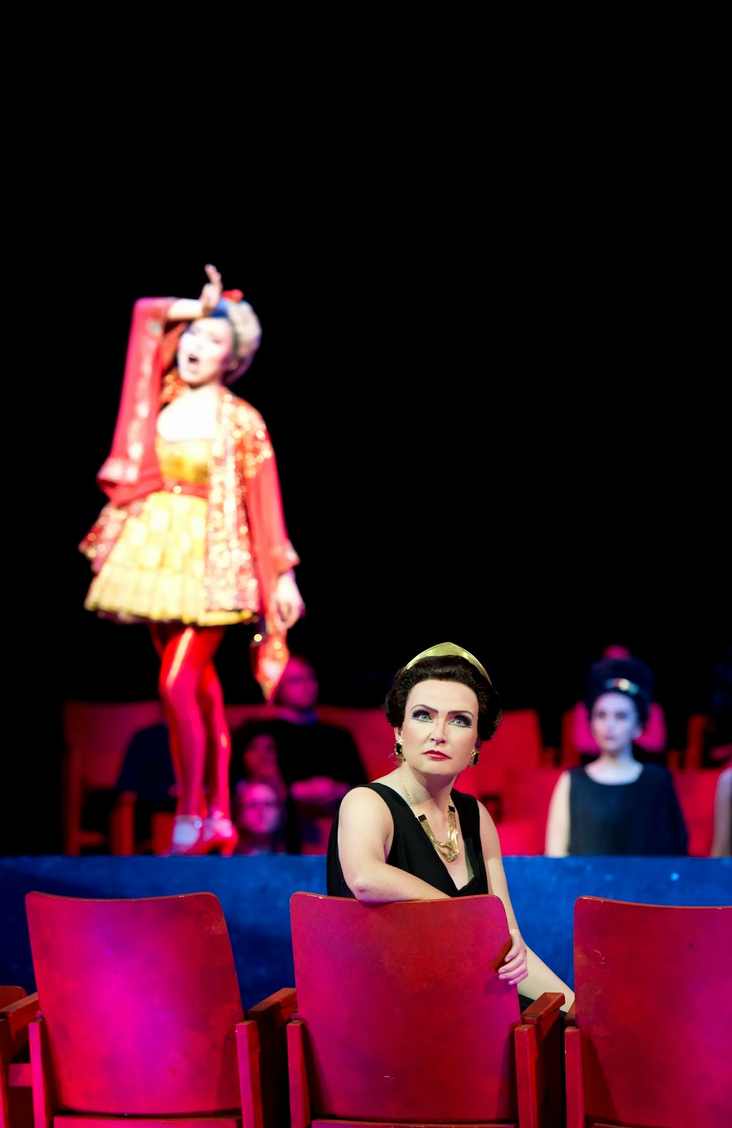 Christian Stückl (in this 2012 production), sets the action in the present, transforming the Tanzmeister into a delightfully sleazy manager representing the buffo players, who enter wearing neon green sweatsuits, and vaguely resembling the Black Eyed Peas. The stage consists of, well, a stage surrounded by seats identical to those in the theater.