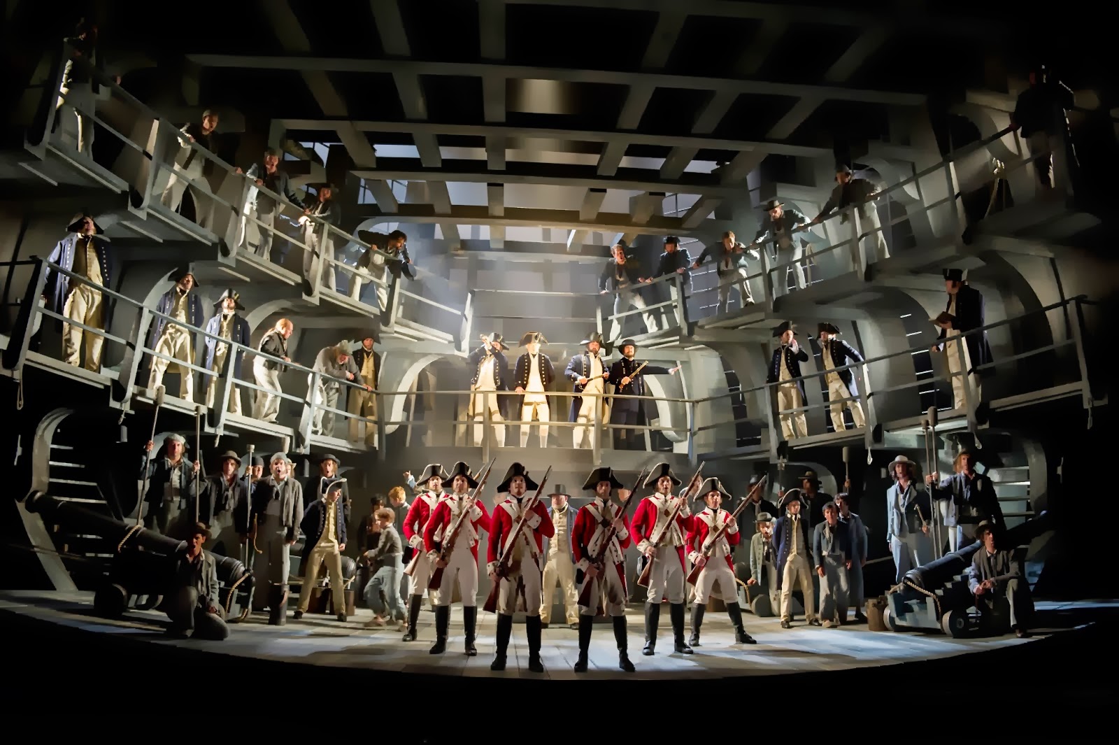 Christopher Oram’s set is terrific, it easily conveyed how prison-like working on a ship can be. The set is angled and even the floors curve down toward the center as a ship’s would. There is no escape, no privacy on board and tormenters abound. Even the sleeping quarters are open with men in hammocks in the same open space. Jacques Imbrailo as Billy Budd was great. I understand that Billy Budd is supposed to be played by a very tall and strong strapping man, but the smaller yet tough Imbrailo seemed more fitting. His voice was clear and he was strong, hanging from the edge of the decks, raising and lowering himself with his muscular arms, yet his smaller stature added to his appeal as a softer, more thoughtful and sensitive soul. Clearly not your typical sailor.